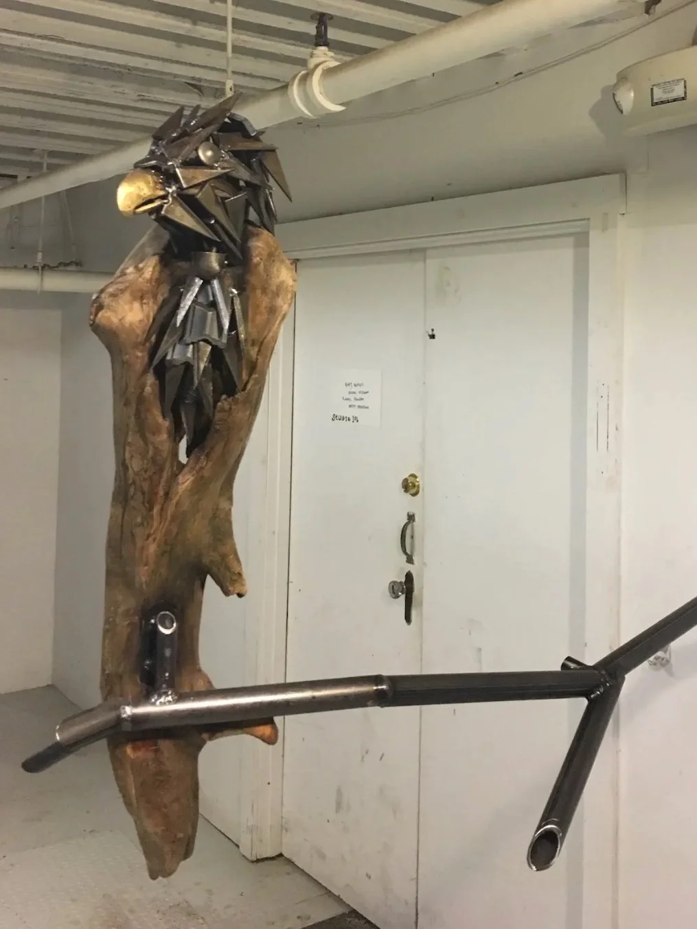 Rory Beerits has developed a sculptural style that blends traditional metalworking and found object assembly to explore the spiritual power of the natural world. Using everyday materials from our anthropocentric era, he reimagines discarded objects into powerful animal icons. His process is ritualistic, deeply considering animal anatomy and carefully selecting materials from junkyards, street corners, and fellow upcyclers. Scythes become wings, colanders transform into scales, and wrenches shift into pincers. These creatures, poised between the recognizable and the otherworldly, evoke transformation and touch upon the sacred space where instinct and intuition intersect. Beerits invites reflection on personal metamorphosis.